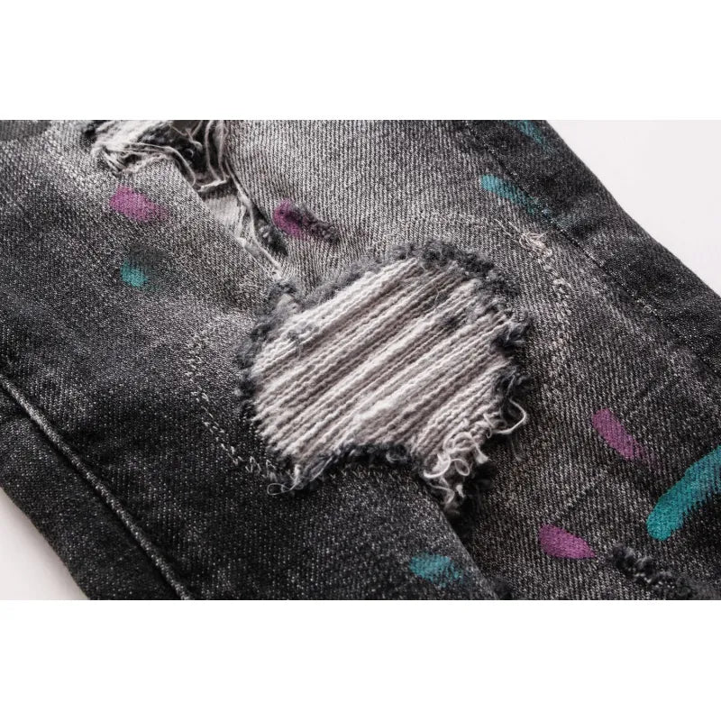 Men's Ripped Patch Jeans Youth Slim Pants Biker Pants Inkjet Personality