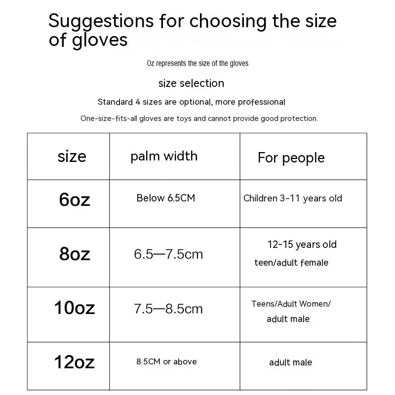 - Sizes: Available in 6 oz, 8 oz, 10 oz, and 12 oz to suit various training needs.
