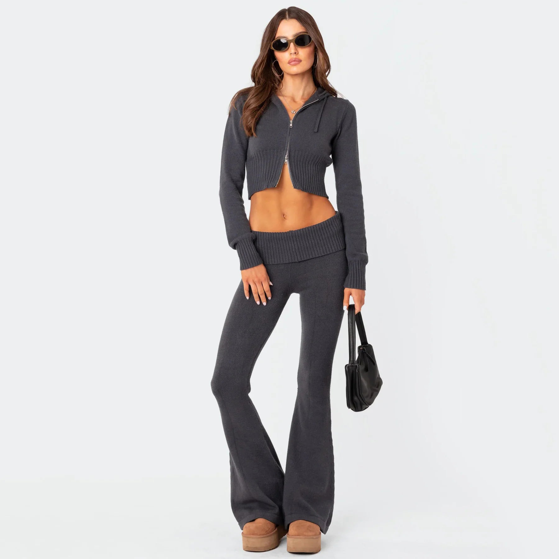 Women's High-Waist Knit Hooded Set: Fashionable Long-Sleeve Top & Trousers