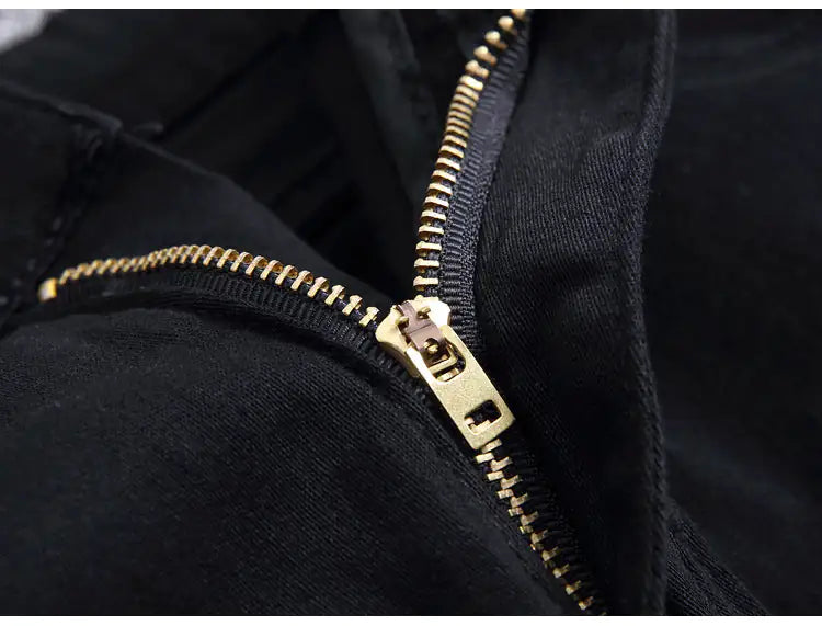 Step up your fashion game with these trendy zippered holes elastic denim pants. Their unique design and comfortable fit make them a must-have addition to your closet. Perfect for any casual outing, these pants will ensure you stand out in style.